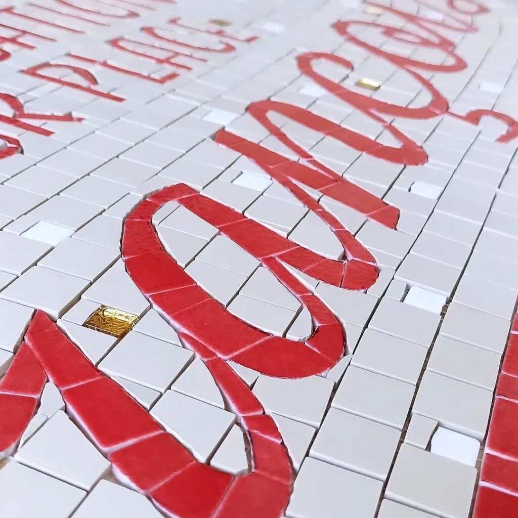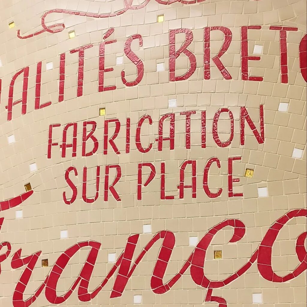 Ce projet pour https://www.instagram.com/francois_vannes/ est une des réalisations des plus complexes avec ces nombreuses écritures fines et manuscrites. Des heures de travail pour couper une à une chaque tesselles à la main . Visible lors de vos commandes au comptoir de chez François, cette mosaïque composée de grès et d’émaux vient marquer l’identité de la boutique sur un mur de faïences aux mêmes couleurs. 1,20 / 80 cm Merci à François pour sa confiance et à Marco mp carrelage qui s’est occupé de la pose .