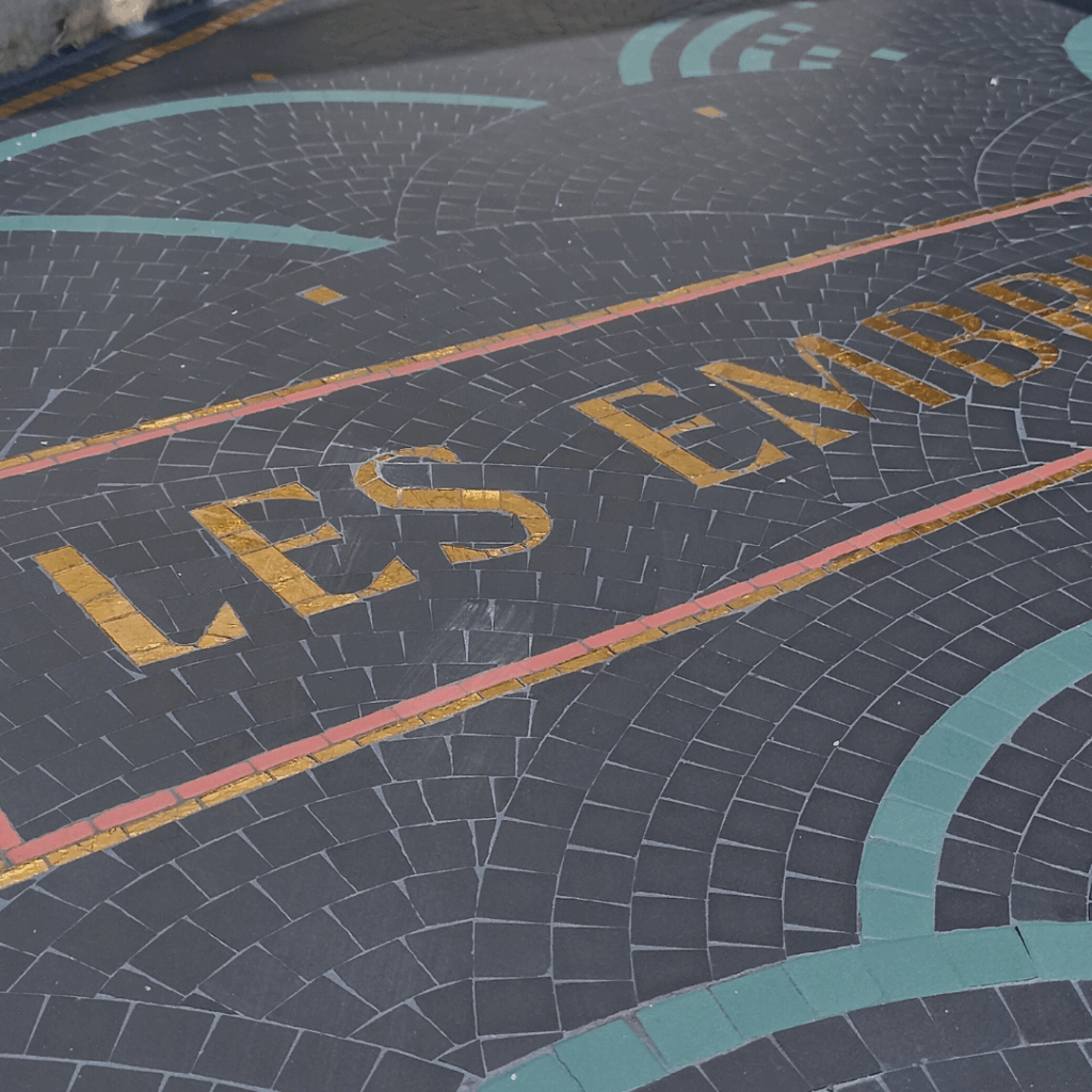 Le fond rappel les carreaux de mosaïques existant sur les murs des halles et l’esthétique des algues et plantes marines à été pensé de manière à s’approcher au plus près de la réalité.