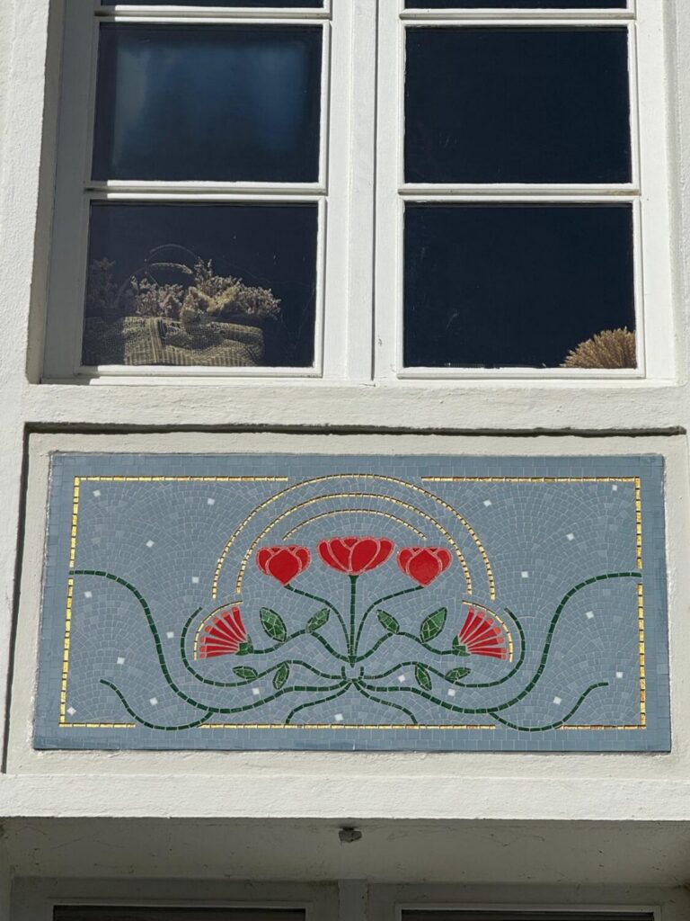 Cette mosaïque apporte une identité sur la façade et surtout sa création est pleine de sens . Certains carreaux utilisé ont été récupérés et sont des trouvailles de famille .