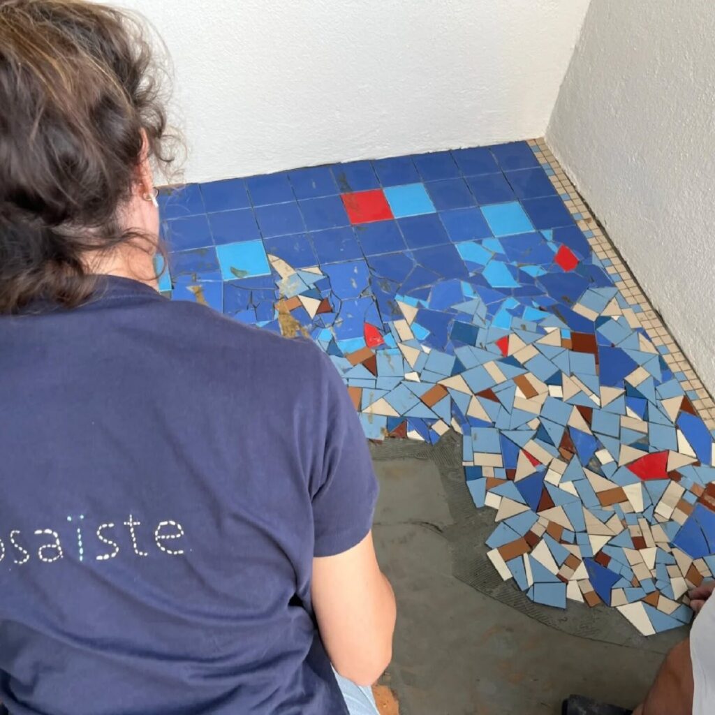 Mosaïque faite en atelier puis la pose sur chantier .